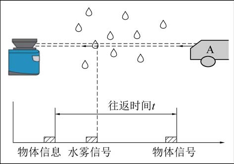 激光雷达采用飞行时间法(TOF)测距[10-11]。其基本原理如图2 所示,激光雷达不断扫描获取测量角度范围内的距离信息,重建测量目标物体的三维形貌。 此外, LMS111 传感器具有防止粉尘、水雾干扰的特性[12]。 当雷达前方有水雾或粉尘阻隔测量时,会接收到反射强度低的水雾或粉尘光脉冲信号但不会立刻结束计时,而是等待强度更高的目标物体A 信号计算往返时间,若在规定的等待时间内没有强度更高的信号,则不再计算往返时间,并记此段距离为缺失值。 通过多次回波处理技术,可以保证在环境恶劣的综放工作面完成测量任务。