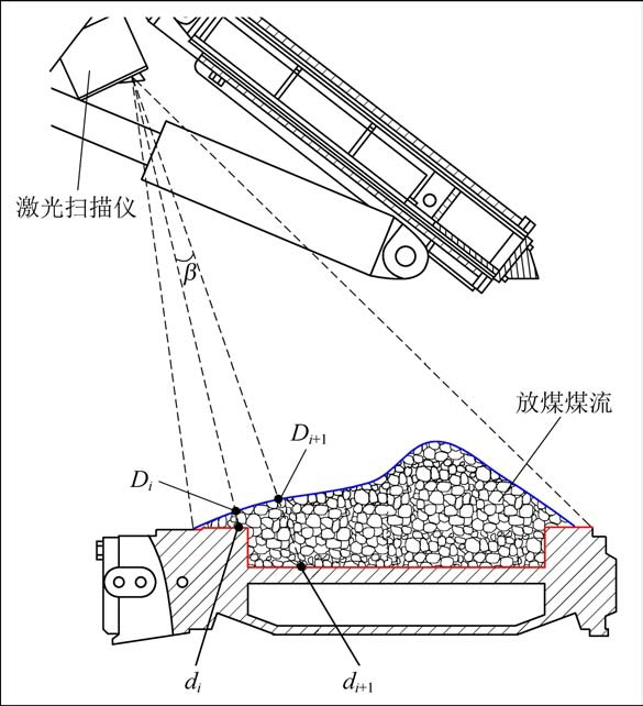 如图1 所示,刮板输送机上部的煤流相对支架作直线运动,安装在支架尾梁下方的扫描装置以固定频率获得堆煤的截面轮廓高度信息,通过对不同时刻的煤流表面轮廓进行激光扫描采样,形成一段时间内的堆煤截面高度参量序列,可以计算获得一段时间内的运煤量,而运煤量和放煤支架放煤口的放煤量具有一一对应的关系,即可获得工作面放煤量信息。