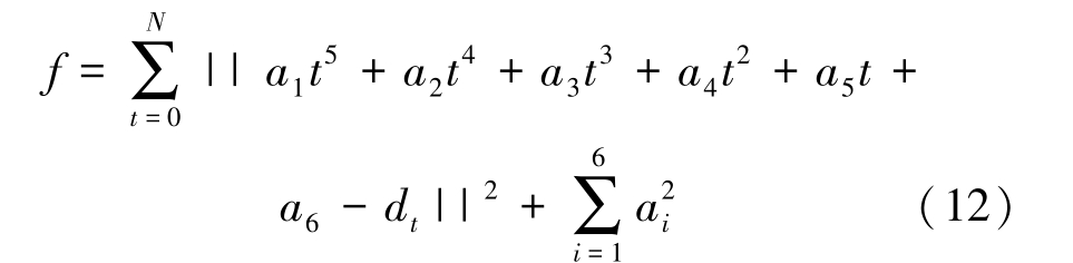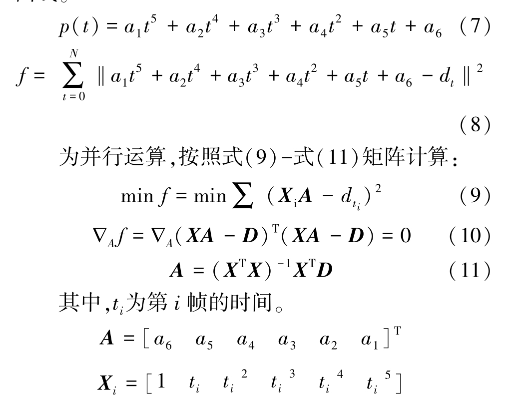 a1 ~a6 为多项式p(t)的6 个待解参数;ti 为第i帧的时间,Xi 为时间ti 的多次幂的行向量;A 为待解参数的列向量;X 是多个Xi 行向量组成的矩阵;dti为ti 时刻的测量距离;D 为多个dti 组成的列向量;∇为偏导符号;∇A f 为损失函数f 中A 的偏导数。
