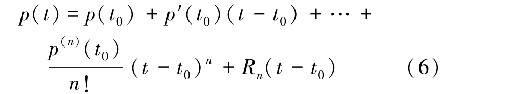 假设①中被测物体只存在简单的较慢变化,说明了物体形貌随时间的变化情况:被测物体曲线应当平滑且处处连续和可导。 因此,曲线随时间的变化是可以被泰勒公式所描述。 当物体曲线p(t)在t0处连续和高阶可导时,可被泰勒表达式(6)表达,Rn为peano 余项。 需要注意的是,该表达式只可以用来描述物体形貌t0时刻邻域的变化,超出t0时刻邻域将会造成peano 余项的巨大偏差。