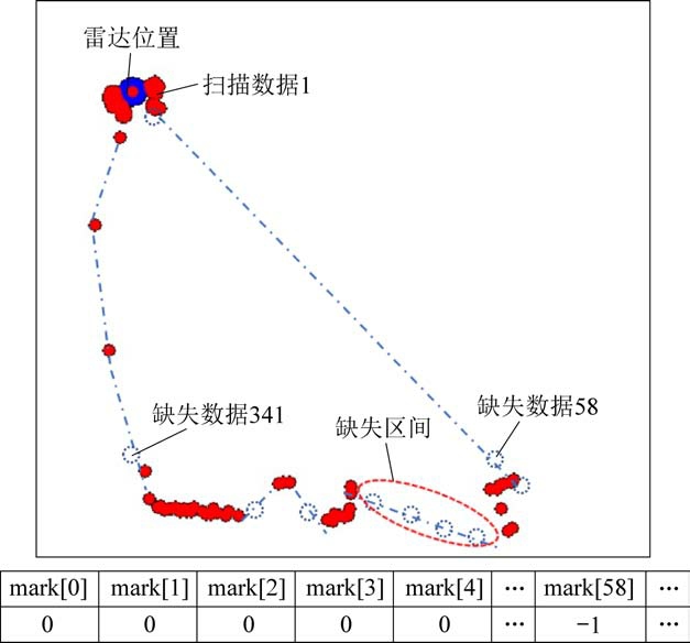 对数据进行初次扫描,检查缺失数据的位置,如果发现缺失数据,要将该位置标记起来。 图5 中,蓝点标记为雷达位置,红点为扫描数据,蓝色虚点为缺失数据, mark[i]记录了第i 个数据的缺失以及分类情况,如果发现第i 个点数据缺失,那么会先将mark[i]临时标为-1,反之则为0。 之后对缺失数据进行聚类时,会改写mark[i]的值。 如数据1 为扫描数据,则mark[i] =0;数据58 为缺失数据,则mark[58]为-1。