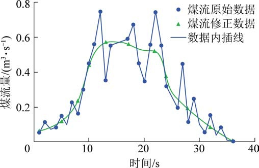 对综放工作面放煤煤流量数据进行大量采集。图14 展示了其中一段数据,这段数据中开始放煤时间为0~5 s,正常放煤时间为5~30 s,结束放煤时间为30~36 s,最大放煤流量为0.58 m3/s。