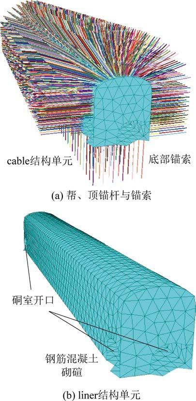 锚杆、锚索使用cable 结构单元[18]模拟,严格按照设计位置布置锚杆与锚索,顶板和帮部安装锚杆、锚索111 排,底板安装锚索50 排,其中锚杆4 362根、锚索4 329 根。 锚杆、锚索均为煤矿支护常用规格,其参数已经严格校核[7,11,20],见表2。 钢筋混凝土砌碹采用liner 结构单元[18]模拟,分别布置在顶板、帮部与底板,并连接成整体,形成全断面布置,基于模拟经验设定liner 结构单元参数[11]见表3,厚度设定为0.4 m。 支护模拟实现如图5 所示。