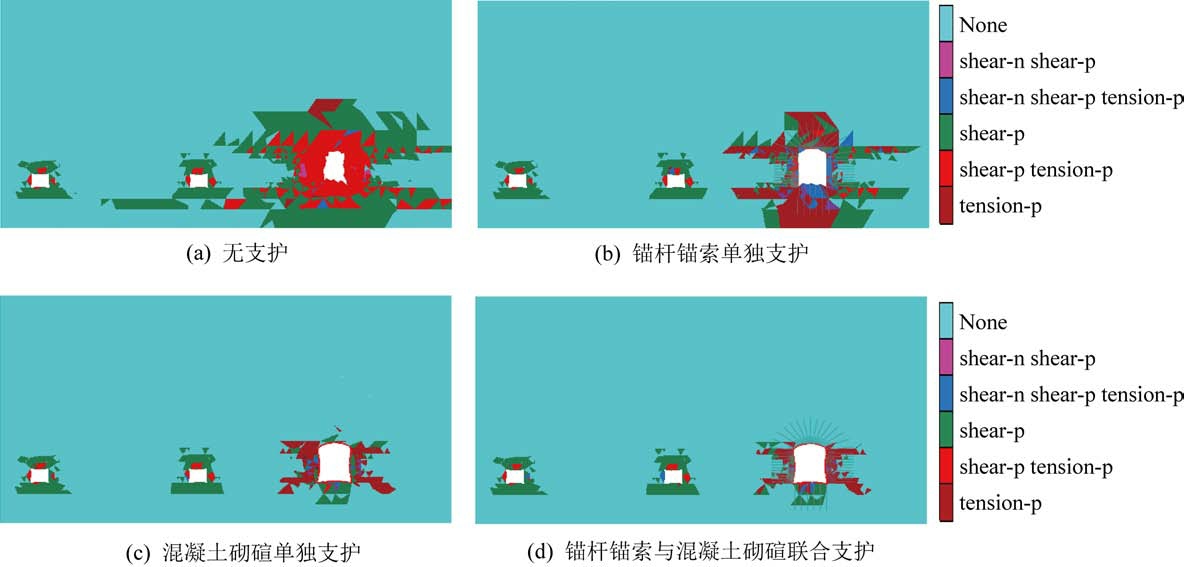 图7 不同支护条件下硐室塑性区模拟结果