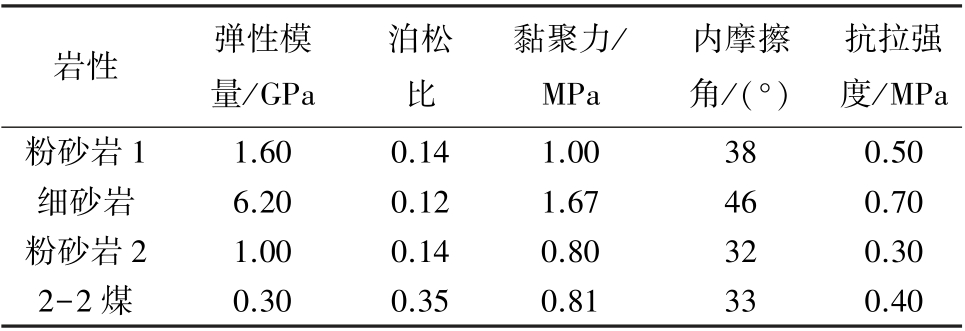 岩性 弹性模量/GPa泊松比黏聚力/MPa内摩擦角/(°)抗拉强度/MPa粉砂岩1 1.60 0.14 1.00 38 0.50细砂岩 6.20 0.12 1.67 46 0.70粉砂岩2 1.00 0.14 0.80 32 0.30 2-2 煤 0.30 0.35 0.81 33 0.40