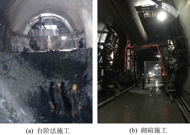 改进支护方案显著减少了锚索施工数量,大幅加快了施工进度,节约了工程成本。 液压支架拆解组装硐室按照改进支护方案施工后,在未进行混凝土砌碹支护之前,围岩变形较为明显,两帮移近约为150 mm,底鼓量约为90 mm,并且仍保持较快的变形速度。 及时进行混凝土砌碹支护之后,进行了为期3 个月的监测,基本无变形,表明改进支护方案能够有效控制超大断面液压支架拆解组装硐室的变形破坏。 液压支架拆解组装硐室施工过程如图9所示。