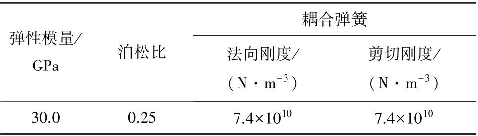 耦合弹簧弹性模量/GPa 泊松比 法向刚度/(N·m-3)剪切刚度/(N·m-3)30.0 0.25 7.4×1010 7.4×1010