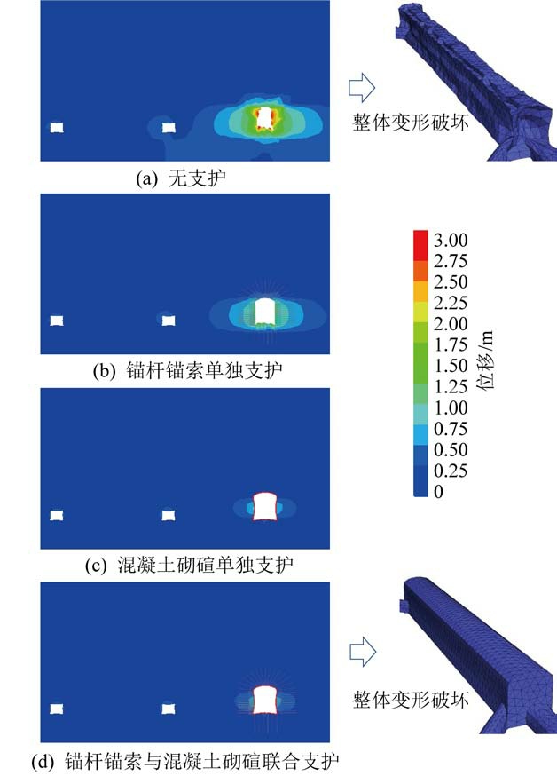 图6 不同支护条件下硐室变形破坏模拟结果