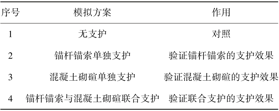 序号 模拟方案 作用1无支护 对照2 锚杆锚索单独支护 验证锚杆锚索的支护效果3 混凝土砌碹单独支护 验证混凝土砌碹的支护效果4 锚杆锚索与混凝土砌碹联合支护 验证联合支护的支护效果