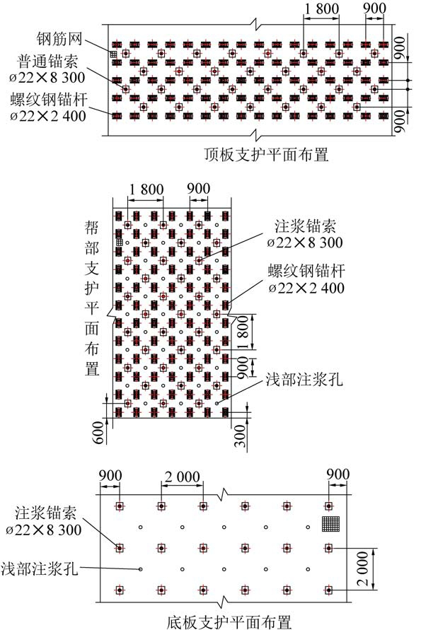 由模拟结果可知,在初始支护方案条件下,液压支架拆解组装硐室帮部中间部位和底板中间部位仍有一定变形量,考虑到锚杆锚索的支护密度已足够大并且混凝土砌碹的支护效果优于锚杆索,尝试将混凝土砌碹厚度增大至0.5 m,模拟发现继续增大混凝土砌碹厚度对硐室变形控制效果的改善极为有限。 在初始支护方案参数不变的条件下,尝试提高硐室周边围岩参数,模拟表明硐室变形情况得到了显著改善,硐室帮部和底板的变形几乎完全消除。鉴于此,对初始支护方案作2 个方面的改进:一是适当降低锚杆锚索的支护密度,二是针对变形部位进行注浆补强。 具体改进如下:顶板锚索间排距由900 mm×900 mm 改为1 800 mm×900 mm,采用五花布置;帮部锚索间排距也由900 mm×900 mm 改为1 800 mm×900 mm,锚索改用注浆锚索,规格为ø22 mm×8 300 mm,进行深孔注浆,在移除锚索位置布置浅孔,规格为ø42 mm×3 000 mm,进行浅孔注浆;底板锚索间排距不变,改用注浆锚索,进行深孔注浆,在相邻4 根锚索中间位置进行浅孔注浆。 深孔注浆滞后浅孔注浆7 d 左右。 改进支护方案如图8所示。