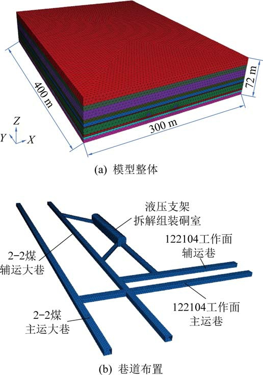 使用FLAC3D 6.0 软件建立数值模型,对液压支架拆解组装硐室的初始支护方案进行模拟验证。 以液压支架拆解组装硐室及其周围巷道100 m 范围划定模型水平边界,按照柱状图取2-2 煤层上、下共计10 个岩层划定模型竖向边界,模型尺寸为300 m×400 m×72 m(长×宽×高),巷道和硐室均严格按照实际和设计布置,数值模型如图4 所示。