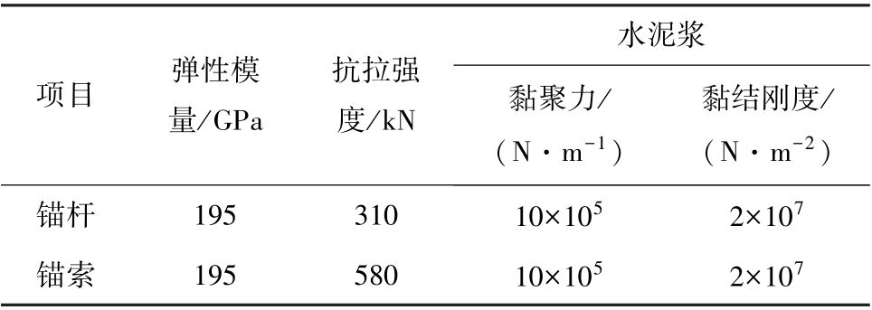 水泥浆项目 弹性模量/GPa抗拉强度/kN 黏聚力/(N·m-1)黏结刚度/(N·m-2)锚杆 195 310 10×105 2×107锚索 195 580 10×105 2×107