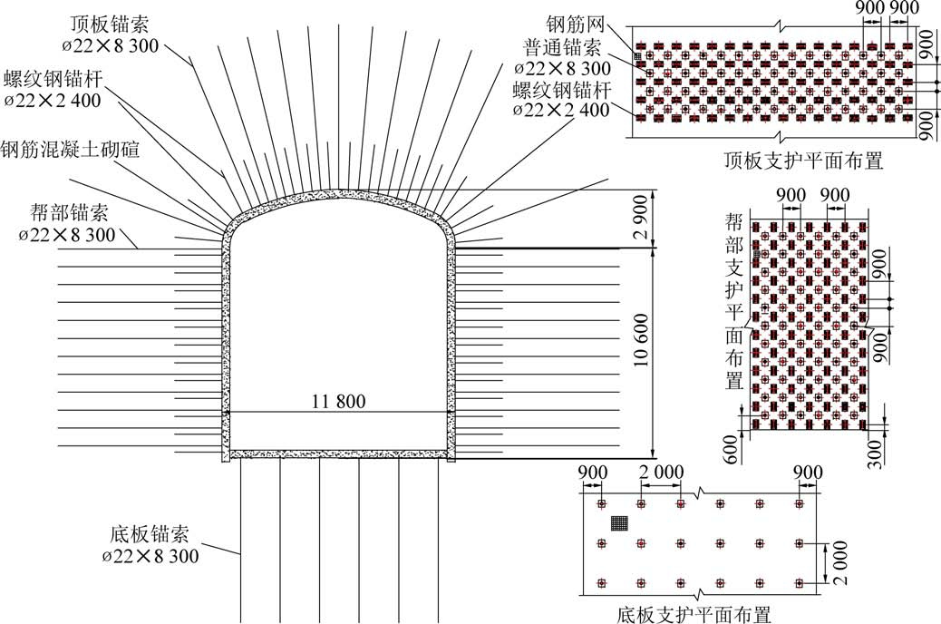 由于“锚杆锚索+混凝土砌碹”联合支护方案被证实对煤矿井下大断面硐室具有良好的支护效果,液压支架拆解组装硐室采用锚杆锚索作为一次支护、混凝土砌碹作为2 次支护,并根据工程经验,给出具体支护参数,形成初步支护方案,如图3 所示。锚杆锚索具体支护参数如下:①顶板支护。 锚杆规格为ø22 mm×2.4 m,排距900 mm,间距900 mm,每排16 根锚杆。 锚索规格为ø22 mm×8.3 m,排距900 mm,间距900 mm,每排15 根锚索,锚索安装在两排顶锚杆中部。 ②巷帮支护。 锚杆规格为ø22 mm×2.4 m,排距900 mm,间距900 mm,每排12 根锚杆。锚索规格为ø22 mm×8.3 m,排距900 mm,间距900 m,每排11 根锚索,锚索安装在两排帮锚杆中部。③底板支护。 底板仅采用锚索支护,锚索规格为ø22 mm×8.3 m,间距2 000 mm,排距2 000 mm,每排布置6 根锚索。 永久支护为全断面钢筋混凝土砌碹,采用现浇钢筋混凝土形式施工,钢筋规格为ø20 mm,混凝土强度等级为C35,厚度为400 mm。