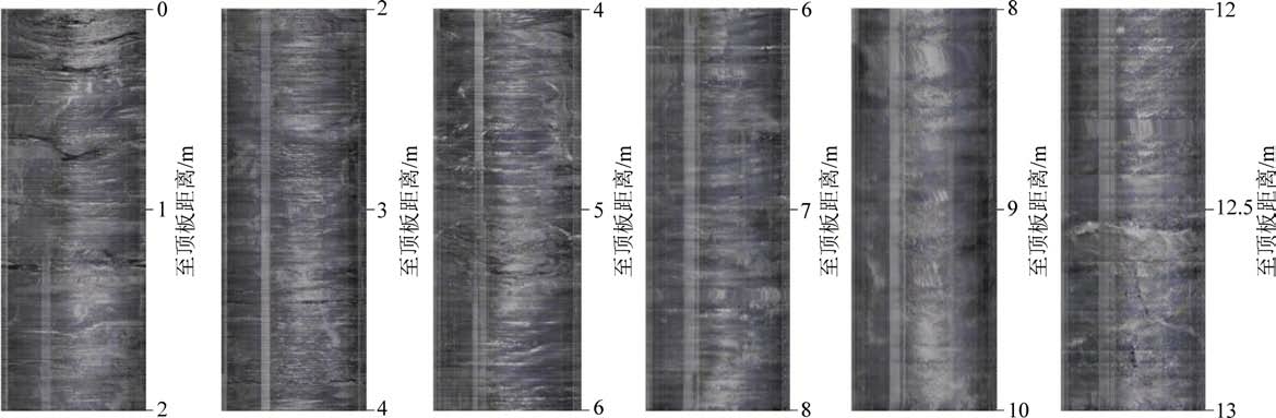 6 号钻孔测点位于运输巷侧工作面前方60 m。监测深度12.95 m,此测点上方岩石虽然同样受到一次采动影响,但是影响范围小,只有岩层浅部有轻微破碎,总体完整性好。 6 号钻孔不同深度覆岩裂隙发育特征如图7 所示。