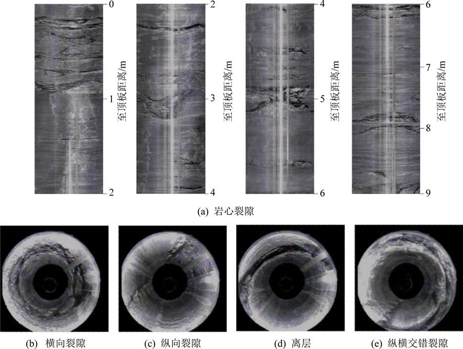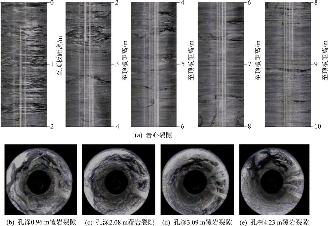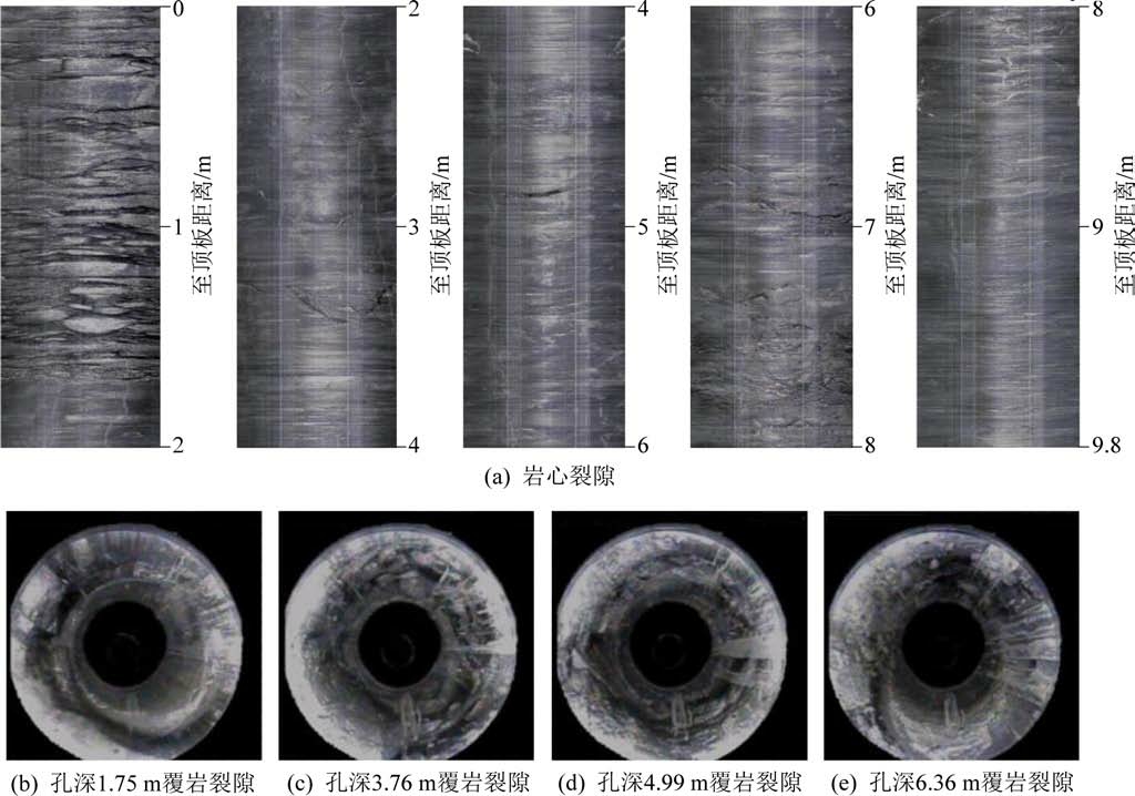 4 号钻孔仅在顶板以上0~2.5 m 覆岩裂隙发育充分,2.5 m 以上岩层完整性较好,仅存在部分层间原生裂隙。 3 号钻孔覆岩整体完整性较差,其中,0~3.2 m 裂隙发育较充分,岩层整体较为破碎,3.2 ~6.6 m 层间横向裂隙较多,在6.2 m 深处存在离层现象。 可见受一次采动及留巷后巷道顶板上覆岩层活动的影响,不仅对巷道顶板浅部岩层破坏较大,对巷道顶板深部岩层也有较大影响,浅部裂隙进一步发育贯通,岩层层面进一步破碎,深部岩体裂隙进一步发育。