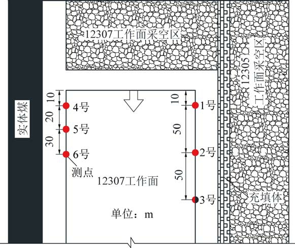 测点布置如图1 所示,沿走向在12307 工作面回风巷布置1、2、3 号测点。 方便观察巷道在二次采动影响下,直接顶与基本顶的裂隙场发育特征。 沿走向在12307 工作面的运输巷布置4、5、6 号测点。便于测定巷道受到超前支承压力作用时覆岩裂隙的发育特征。 直接顶的平均厚度约为2 m,基本顶的平均厚度约为4 m,根据实际需要,每个孔深约为10 m,孔径为32 mm。