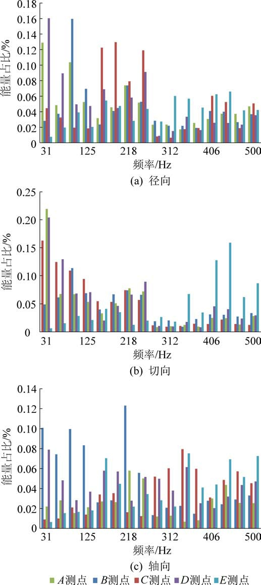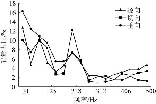 从图7 中可以得出,径向和切向的两个分量的能量占比主要集中在250 Hz 以内。 而各个测点的能量占比趋势也是符合先逐渐减小,然后在125 Hz左右增加,在218 Hz 处达到顶点,然后呈波动逐渐衰减,向低频段移动。 虽然个别测点存在能量波动较大的现象,与爆破现场不稳定有关。 值得关注的是轴向的能量变化趋势较于径向和切向更为明显,变化更大。 即下降比径向和切向更快,突增也比径向和切向更为明显,在高频段的频率占比也较大,易引起共振现象。