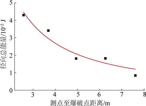 根据试验得到的振动信号总能量,作出不同测点处的振动能量分布如图5 所示,从图5 中可以看出爆破作用下各点振动能量随测点距离的变化。