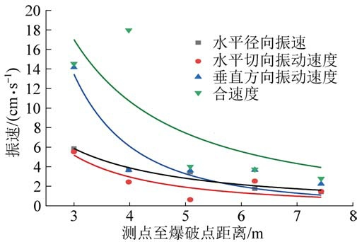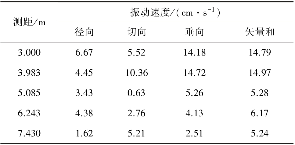 测距/m 振动速度/(cm·s-1)径向 切向 垂向 矢量和3.000 6.67 5.52 14.18 14.79 3.983 4.45 10.36 14.72 14.97 5.085 3.43 0.63 5.26 5.28 6.243 4.38 2.76 4.13 6.17 7.430 1.62 5.21 2.51 5.24