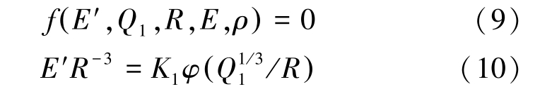 爆破振动能量的衰减过程极其复杂,李洪涛等[21]将单段、多段爆破最大药量与总药量视为定值,推导出爆破振动能量衰减公式,该公式在应用研究中,取得了积极的成果。 但由于药量定值的限制,还存在一定误差。 单仁亮等[14]利用量纲分析法推导出的公式,较好弥补了这个缺点。 参考单仁亮等[14]研究,将岩石爆破振动参数转换为冻结黏土爆破参数进行研究。 该公式将能量E′与等效药量Q1、弹性模量E 、密度ρ 联系起来,函数关系如下: