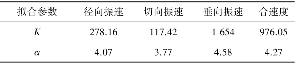 曲线拟合程度:径向方向、切向方向、垂向方向以及合速度方向的决定系数R2 分别为0.97、0.97、0.98 和0.98,相关性较好,其中径方向相关性最好。 将拟合得到的K、α 值代入萨道夫斯基公式,得到各分量及合速度的拟合公式如下: