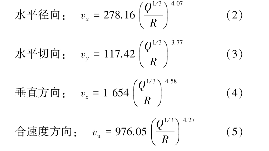从表1 中看,各向振动速度呈现出差异,垂向方向振动速度>径向方向振动速度>切向方向振动速度,说明了冻土爆破后应力波的传播主要是沿某个特定方向。 单仁亮[15]在对冻结岩壁的振速研究中,也得出岩体振动具有明显方向差异性,说明了冻土和岩石爆破的振速传播均具有方向的差异性。 对于爆破振动速度v,我国普遍使用萨道夫斯基经验公式[16]: