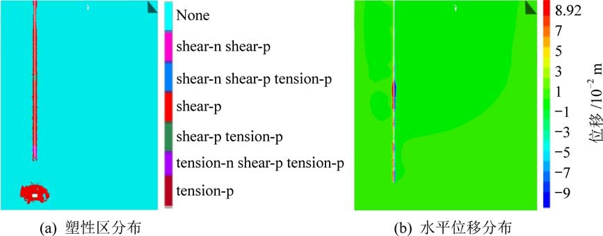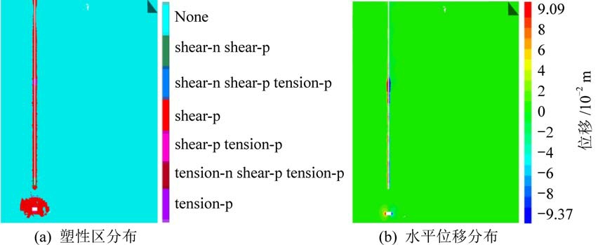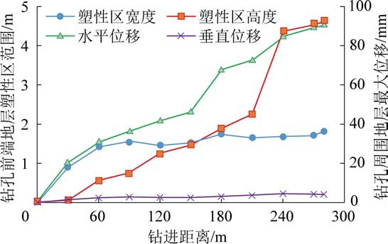 通过对钻进过程每一步的塑性区范围及地层位移数值提取统计,并绘制随钻进距离变化的曲线,如图7 所示。 可以看出,钻进过程围岩的垂直位移变化极小,基本在5 mm 以内,而水平位移随着钻进深度增加逐渐增大,最大可达90 mm。 钻孔前端塑性区宽度受钻进深度影响不大,基本保持在1.5 ~2.0 m,塑性区高度随钻进深度增加呈增大趋势,尤其在岩层强度低或黏聚力小的地层,塑性破坏比较明显,最大高度可达到4.6 m。