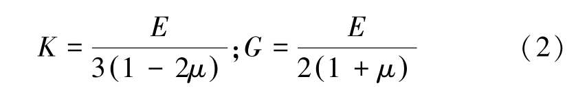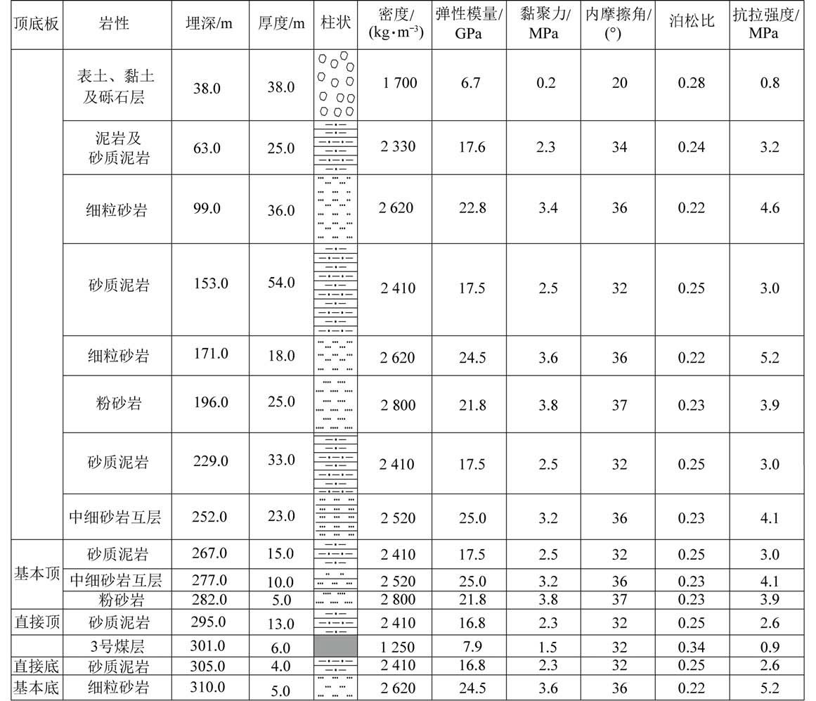 在Mohr-Coulomb 模型中,需要定义煤岩层的物理力学参数主要有弹性体积模量、黏聚力、内摩擦角、弹性剪切模量和抗拉强度等,在赋参数时采取了各煤岩层各向同性且属性均匀的简化措施。 根据地质钻孔资料及岩石力学试验结果,研究区煤岩层的岩体物理力学参数如图1 中所示,其中数值模拟计算用到的体积模量(K)和剪切模量(G)可以根据弹性模量(E)和泊松比(μ),通过以下公式计算得到:
