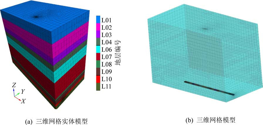 模型位移边界条件为:左右边界约束水平位移为0;前后边界约束水平位移为0;模型底部限制水平和垂直位移均为0;模型顶部边界为自由面。