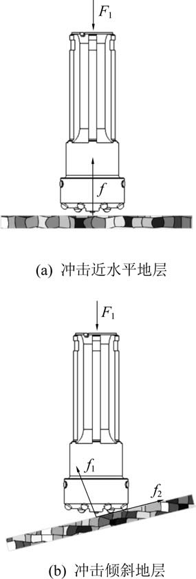 1)地层因素主要钻遇硬、脆、碎、层理倾斜等复杂地层导致钻具冲击做功时受力不均,无法实现轴向集中做功,潜孔锤钻头在地层中钻进时受力状态如图9 所示,冲锤冲击力F1作用在钻头上,钻头将冲击力传递给地层,实现冲击破碎。 与此同时,地层反作用力f 作用在钻头上实现力的平衡,当地层与钻头垂直时,冲击力F1 =f;当钻头与地层存在夹角时,反作用力f 分解为垂直地层作用力f1 和平行于地层的摩擦力f2(f =f1+f2),此时f1与钻头轴向存在夹角,导致钻头轨迹偏离,通过钟摆钻具组合和钻压控制井眼轨迹垂直度。
