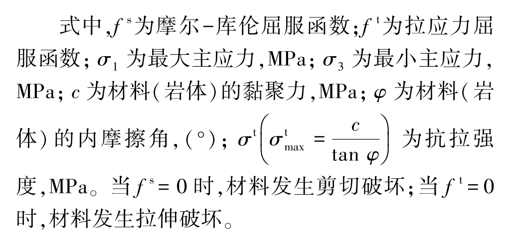 由于数值模拟具有周期短、成本低、计算结果相对精确等优点,被大量应用在岩土工程、采矿工程及地质工程等领域[16-19]。 FLAC3D是一种基于三维显式有限差分法的数值模拟计算分析方法,具有强大的前后处理功能,能够很好地模拟工程地质材料在达到强度极限或屈服极限时所发生的变形破坏或塑性流动的非线性动力学行为[20-21]。 选择FLAC3D中的Mohr-Coulomb 弹塑性本构模型,以较好地反应岩体的剪切及拉张破坏特性。 Mohr-Coulomb 屈服准则判别表达式为: