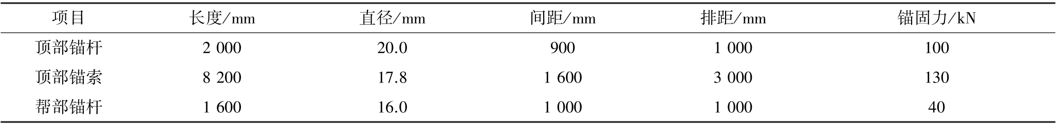 项目 长度/mm 直径/mm 间距/mm 排距/mm 锚固力/kN顶部锚杆 2 000 20.0 900 1 000 100顶部锚索 8 200 17.8 1 600 3 000 130帮部锚杆 1 600 16.0 1 000 1 000 40