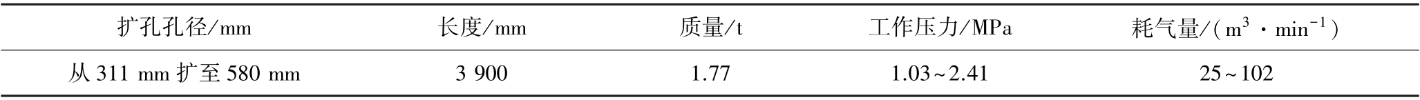 扩孔孔径/mm 长度/mm 质量/t 工作压力/MPa 耗气量/(m3·min-1)从311 mm 扩至580 mm 3 900 1.77 1.03~2.41 25~102