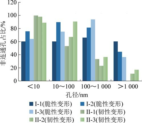 此外,根据不同孔径范围内非连通孔(束缚流体)所占比例的分布(图7),可以得出脆/韧性变形方式对孔隙连通性的影响程度:孔径在小于10 nm范围内,韧性变形样品中非连通孔隙所占比例为89.40% ~99. 55%, 明 显 高 于 脆 性 变 形 样 品 的61.42%~77.08%;在10 ~100 nm,两者相当;孔径100~1 000 nm时,韧性变形样品中非连通孔所占比例则明显低于脆性变形样品;而当孔径大于1 000 nm 时,韧性变形样品中非连通孔所占比例则远低于脆性变形样品。
