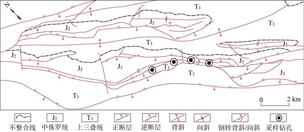 研究区主体出露中侏罗统含煤岩系,主要为河流、滨浅湖、三角洲沉积相,也是煤系泥页岩赋存层位[13],下伏地层为非整合接触的上三叠统地层,同时,在研究区的南缘,上三叠统推覆于中侏罗统之上(图1)。