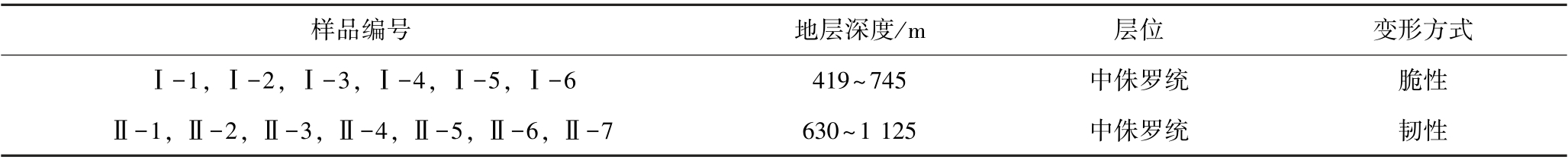 样品编号 地层深度/m 层位 变形方式Ⅰ-1, Ⅰ-2, Ⅰ-3, Ⅰ-4, Ⅰ-5, Ⅰ-6 419~745 中侏罗统 脆性Ⅱ-1, Ⅱ-2, Ⅱ-3, Ⅱ-4, Ⅱ-5, Ⅱ-6, Ⅱ-7 630~1 125 中侏罗统 韧性