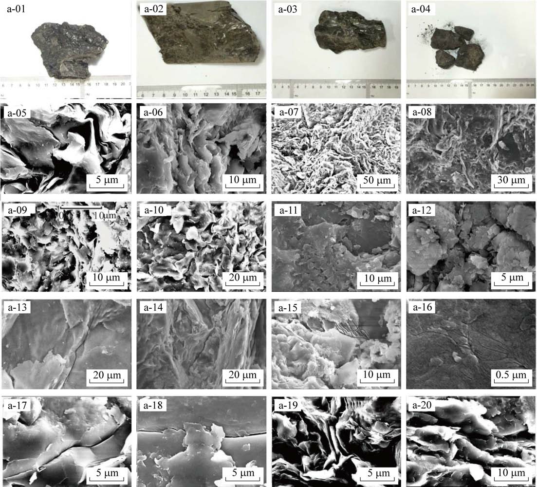 微观上看(图3),样品表现出大量的揉皱现象(a-05,a-06),改变了原有的成层状状分布的矿物颗粒的排布方式,增大了矿物颗粒间的孔隙(a-05,a-06,a-07),这也是韧性变形的标志之一。 本次所采样品除表现出大量的扭折带之外(a-07,a-08),还表现出其他具有韧性特征的现象:①孔隙表现出明显的压缩变形(a-09,a-10),粒间孔所受影响较大(a-11,a-12);②压剪性裂隙大量出现,裂隙呈紧密闭合状态(a-13,a-14),亦有书斜式微裂纹出现(a-15,a-16);③剪切裂隙表现出带状纹理,切口常见碎屑(a-17,a-18);④成层状紧密排列的片状黏土矿物的不规则翻立(a-19,a-20),使得原本紧密排列的黏土矿物出现颗粒间孔隙。