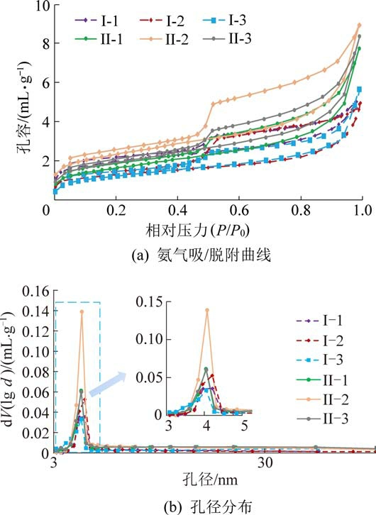 图4 脆/韧性变形样品的氮气吸/脱附曲线以及孔径分布特征
