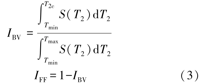 其中,S(T2)为T2谱分布曲线;Tmin为T2最小值,ms;Tmax为T2最大值,ms;T2c 为T2 截止值,ms;IBV 为束缚流体饱和度,%,非连通性孔隙;IFF为可动流体饱和度,%,为了可连通的有效孔隙度占总孔隙度的比例(图6);有效孔隙度值即为总孔隙度与FFI 的乘积。