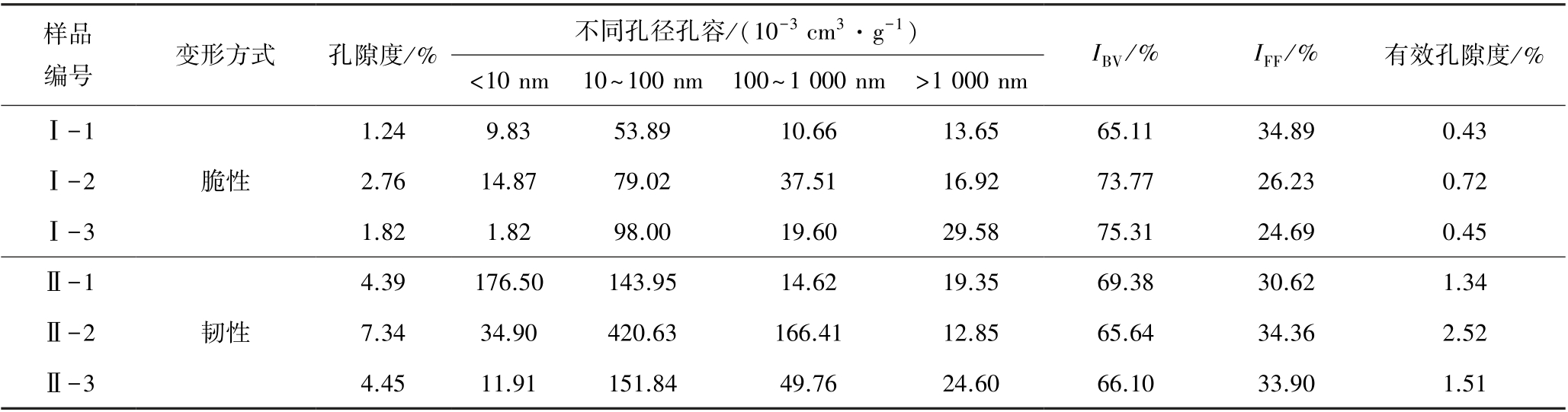 样品编号 变形方式 孔隙度/%不同孔径孔容/(10-3 cm3·g-1)<10 nm 10~100 nm 100~1 000 nm >1 000 nm IBV/% IFF/% 有效孔隙度/%Ⅰ-1Ⅰ-2Ⅰ-3脆性1.24 9.83 53.89 10.66 13.65 65.11 34.89 0.43 2.76 14.87 79.02 37.51 16.92 73.77 26.23 0.72 1.82 1.82 98.00 19.60 29.58 75.31 24.69 0.45Ⅱ-1Ⅱ-2Ⅱ-3韧性4.39 176.50 143.95 14.62 19.35 69.38 30.62 1.34 7.34 34.90 420.63 166.41 12.85 65.64 34.36 2.52 4.45 11.91 151.84 49.76 24.60 66.10 33.90 1.51