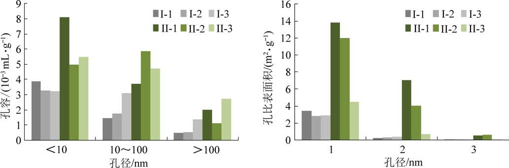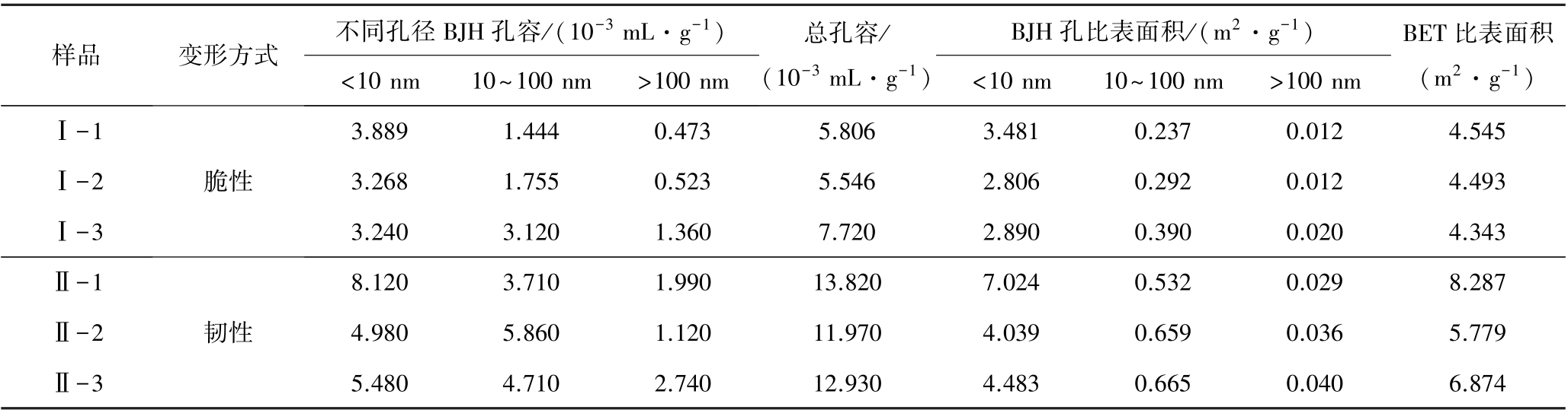 样品 变形方式 不同孔径BJH 孔容/(10-3 mL·g-1)BJH 孔比表面积/(m2·g-1)<10 nm 10~100 nm >100 nm总孔容/(10-3 mL·g-1)<10 nm 10~100 nm >100 nm BET 比表面积(m2·g-1)Ⅰ-1 3.889 1.444 0.473 5.806 3.481 0.237 0.012 4.545Ⅰ-2Ⅰ-3脆性3.268 1.755 0.523 5.546 2.806 0.292 0.012 4.493 3.240 3.120 1.360 7.720 2.890 0.390 0.020 4.343Ⅱ-1 8.120 3.710 1.990 13.820 7.024 0.532 0.029 8.287Ⅱ-2Ⅱ-3韧性4.980 5.860 1.120 11.970 4.039 0.659 0.036 5.779 5.480 4.710 2.740 12.930 4.483 0.665 0.040 6.874