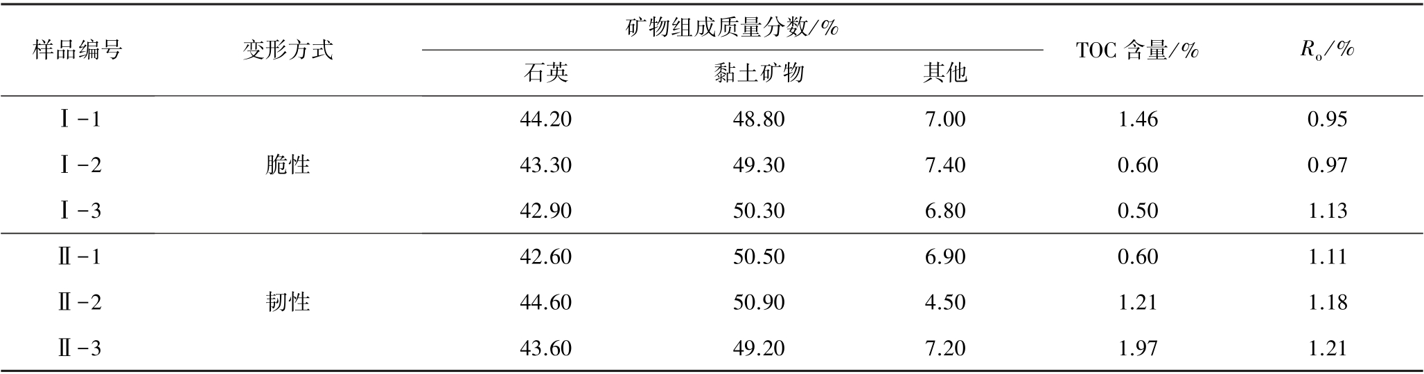 矿物组成质量分数/%样品编号 变形方式石英 黏土矿物 其他TOC 含量/% Ro/%Ⅰ-1 44.20 48.80 7.00 1.46 0.95Ⅰ-2Ⅰ-3脆性43.30 49.30 7.40 0.60 0.97 42.90 50.30 6.80 0.50 1.13Ⅱ-1 42.60 50.50 6.90 0.60 1.11Ⅱ-2Ⅱ-3韧性44.60 50.90 4.50 1.21 1.18 43.60 49.20 7.20 1.97 1.21