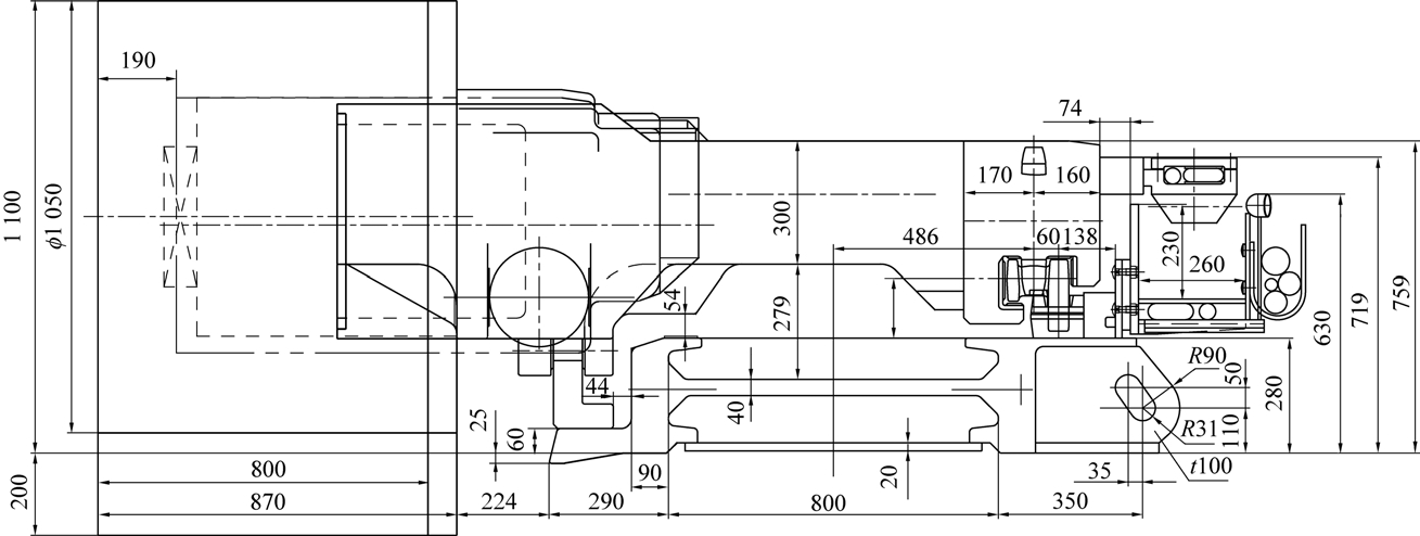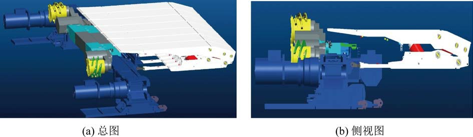 研发了新型采煤机,具有半悬机身(图5)、全悬截割矮机身结构(图6),机身高度759 mm,装机功率1 050 kW,最大牵引速度14.5 m/min;研发了工作阻力9 000 kN、采用防冲击大伸缩比立柱、高强度薄板结构、高刚度抗动载液压支架;研发了大运力、矮机身、重叠侧卸的刮板输送机,其装机功率3×400 kW;研发了薄煤层精小化电液控制装置。