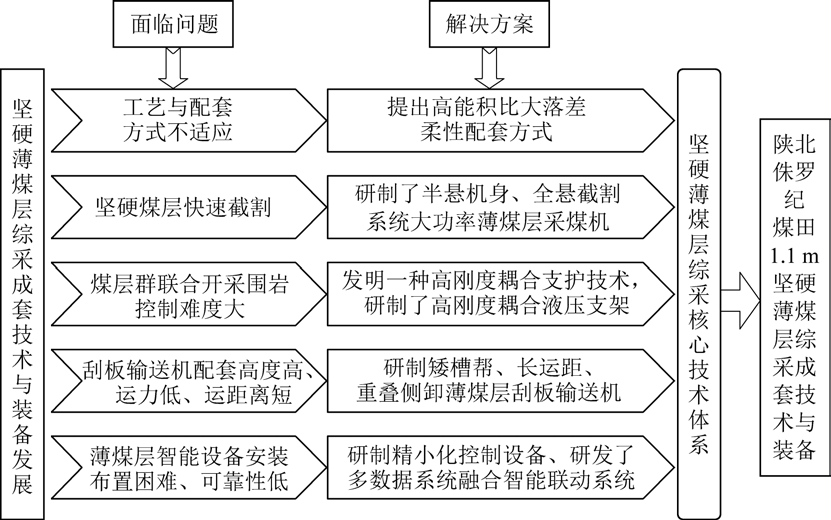 针对1.1 m 薄煤层面临的问题,整体研究思路如图1 所示。 根据陕北侏罗纪浅埋深坚硬薄煤层和坚硬顶底板开采条件,工作面运输巷和回风巷采用沿顶破底掘进,巷道有效净高度为2.5 m,工作面采高为1.1 m,工作面和巷道之间存在1.4 m 的落差,由于工作面采高在1.1 ~1.3 m 变化,工作面和巷道的高差也在1.2~1.4 m 变化,考虑到开采过程的地质构造、巷道变形等因素,高差变化应能适应1.1 ~1.5 m。 如何解决大落差设备的配套、保证落煤效果和智能化系统整体快速推进是需要解决的突出技术难题,整体研究思路如图1 所示。