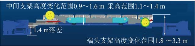 薄煤层开采工作面和巷道存在1.4 m 左右高差,提出了大落差的柔性过渡的配套方式(图4),中间支架实现支护高度0.9 ~1.6 m,端头支架实现巷道支护高度1.8~3.3 m。 刮板输送机机头机尾研发了重叠侧卸的布置方式,实现了刮板输送机和转载机的整体应用,解决了刮板输送机智能整体快速推进的问题。 通过优化设计卸载板角度和增加二次卸载口等方式,保证了良好的落煤和装煤效果。 重叠侧卸的机头机尾配置了液压油缸可以智能升降调节,能够适应工作面和巷道1.1~1.5 m 的高差变化,解决了工作面和巷道大落差的问题。
