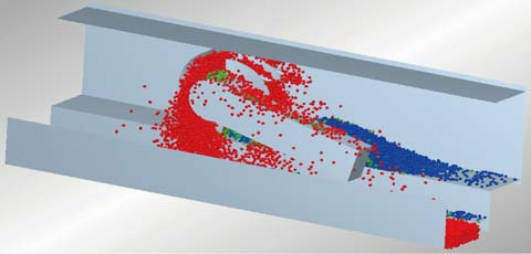 薄煤层采煤机装煤效果一直是困扰薄煤层开采的一个难题,在提升装煤效果方面进行了创新性研究,设计了整体弯摇臂(图7),增加配套挖底量,增大装煤口面积;研发了全新铲煤板结构,改进叶片的螺旋升角,优化滚筒转速,配合牵引速度,有效地提高了装煤效果,装煤效果模拟试验如图8 所示。