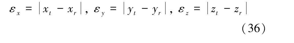 式中,(xr,yr,zr) 为定位终端在导航坐标系的真实坐标,(xt,yt,zt) 为上述算法解算出的导航坐标下的位置坐标;为了对比分析误差在3 个坐标轴上的变化情况,在导航坐标下x, y, z 轴上的误差为: