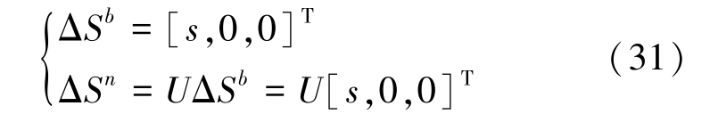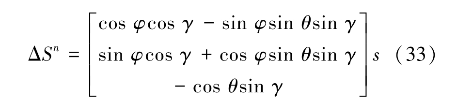 根据上述“一刀一迁移”的策略,采煤机完成一刀截割后,UWB 基站群根据预先设置的距离在导轨上沿着进刀方向进行迁移,为下一刀的端头定位做好准备。 假设基站群在导轨上移动的距离为s, 姿态传感器在导轨上位移增量为ΔSb ,基站群在导航坐标系下的位移增量ΔSn ,其关系为: