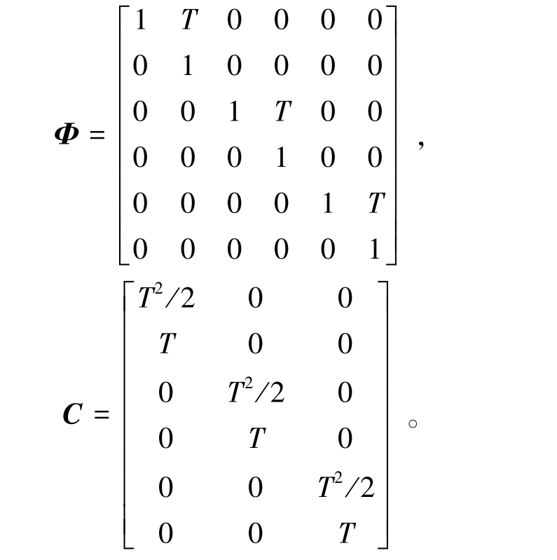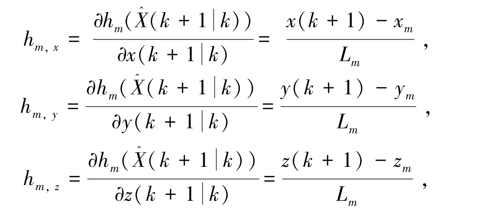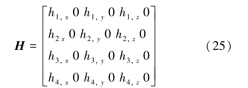 其中(xm,ym, zm)为第m 个基站的坐标,m=1,2,3,4,对观测方程进行一阶泰勒级数展开,忽略二次项以上余项,可得k+1 时刻的雅克比矩阵H,如下: