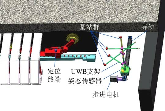 为实现对采煤机进行端头自动校准,提出了基于UWB 端头校准补偿惯性导航定位误差的方法。在综采工作面的两端头处分别设置UWB 定位系统,实现对采煤机上山和下山进行端头定位,为方便分析,只给出了一端的布局图,如图1 所示。 将定位终端模块安装在采煤机机身上,将UWB 基站群设置在综采工作面的端头位置,基站群安装在自制的支架上,通过设置步进电机的脉冲数使UWB 基站群沿着导轨进行整体迁移。 姿态传感器固定在UWB 支架上,能够获得基站群迁移后的姿态,利用蓝牙收发模块将姿态信息传送到上位机,根据每个基站的初始坐标、姿态信息及设定基站群迁移的距离,在上位机的解算系统中能够快速的获得基站群的坐标。 当采煤机上的定位终端模块运行到距离端头5~10 m 时,启动UWB 定位系统,根据双向飞行时间的测距原理,通过UWB 系统自组网的形式获得定位终端与UWB 基站群之间的距离,采用所提的算法求解采煤机的位置信息。 UWB 基站群在初始安装时,采用全站仪标定测量基站群的坐标,同时尽可能保证每个基站与定位终端形成视距环境,由于非视距环境对定位精度有很大影响。 当采煤机完成一刀截割之后,UWB 基站群在导轨上沿着进刀的方向迁移,UWB 基站群可以在采煤机割完两刀或者多刀之后进行迁移,但是容易导致基站群与定位终端处于非视距环境中,非视距换对UWB 信号的传播影响较大,将导致定位精度较差。 因此采用“一刀一迁移”的方式进行定位,迁移距离与进刀量尽可能相等,有利于保持定位终端与基站群初始的视距环境不变。 基站群进行多次迁移后,可以重新标定基站群的坐标。 无论采煤机在上山还是下山,均可采用“一刀一迁移”的方式获得采煤机的位置,为惯性导航系统提供校准的基准。